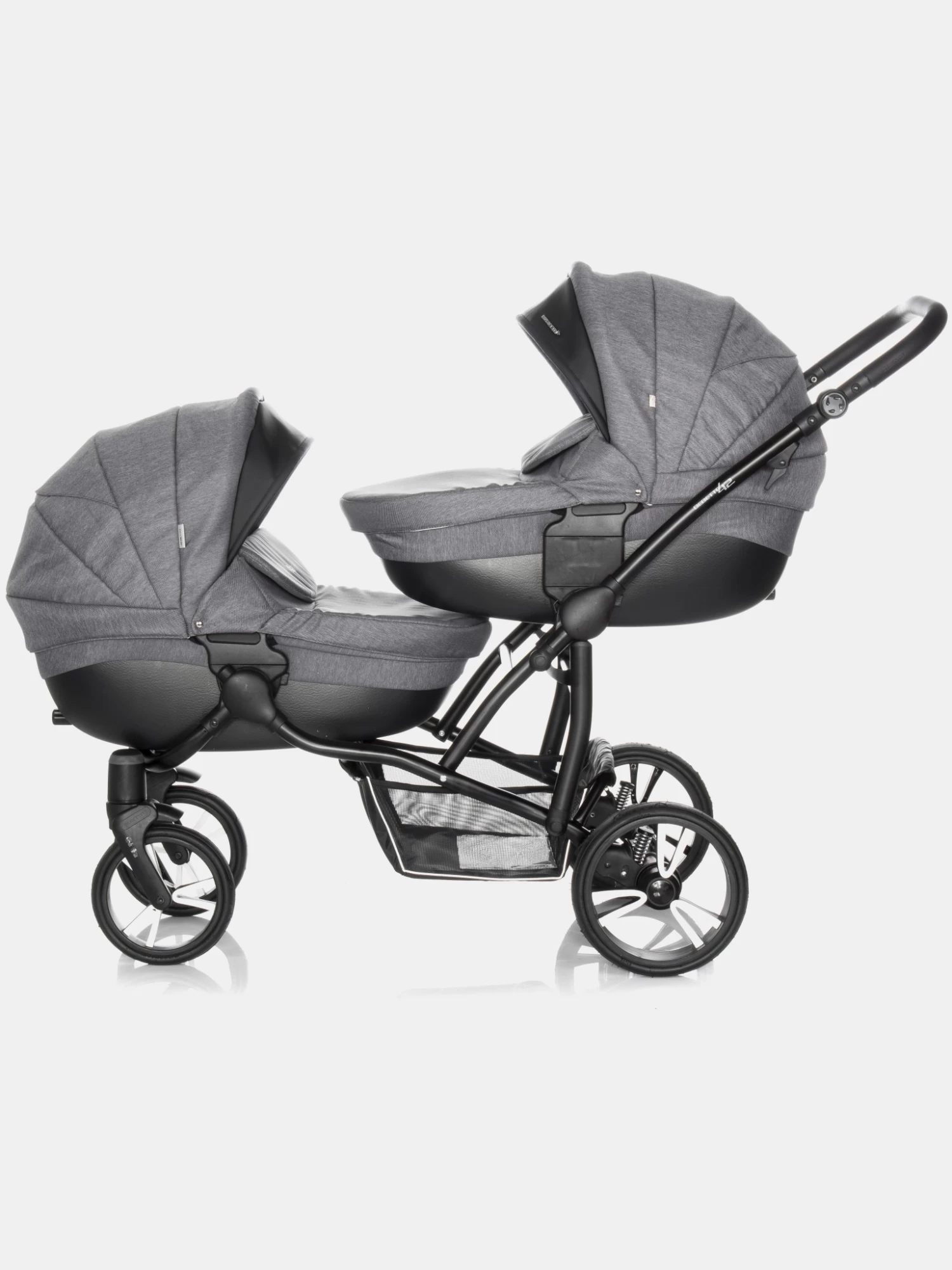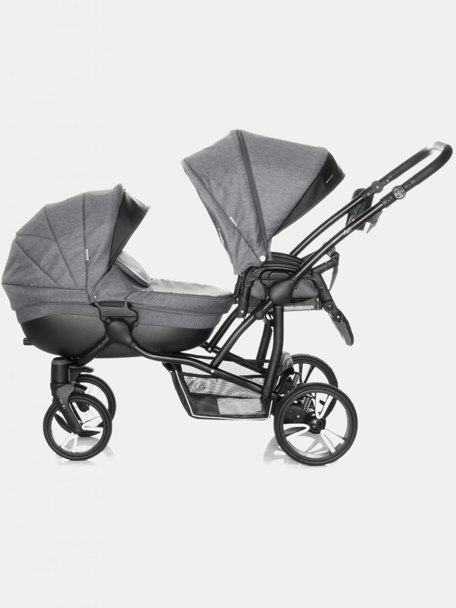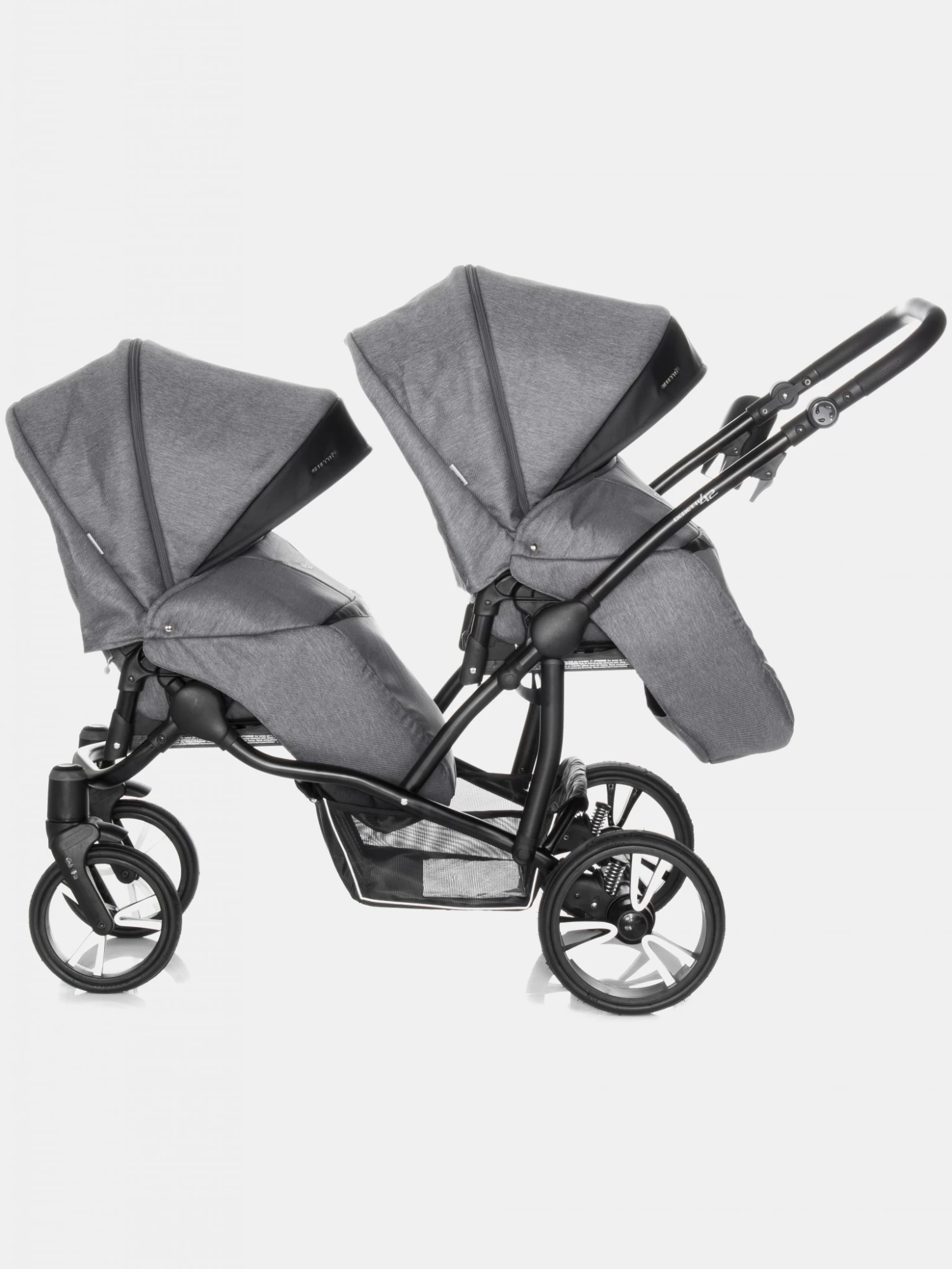 Bebetto 42 ist ein idealer Kinderwagen für Zwillinge, sowie für zwei Kinder im unterschiedlichen Alter, ein sogenannter Geschwisterwagen. Der Kinderwagen verfügt über zahlreiche Einstellungsvarianten, die für jede Situation und jeden Einsatz immer richtig angepasst werden können. Für Zwillinge wird Bebetto 42 mit zwei Babywannen empfohlen. Jede Babywanne verfügt über einen separaten Sonnenschutz, sowie ein verstellbares bzw. einstellbares Kopfteil, sodass auch hier die Einstellungsalternativen jedem Kind die richtige Liege- und Sitzposition gewähren. Mit einer Babywanne und dem Sportsitzaufsatz können Sie mühelos einen sehr schicken und funktionalen Geschwisterwagen zaubern. Dies wird immer dann nötig, wenn man zwei Kinder im unterschiedlichen Alter sicher und komfortabel transportieren möchte. Was den Kinderwagen auszeichnet, ist der leichte und stabile Aluminiumrahmen, sowie seine Abmessungen. Die Kinder sitzen in diesem Wagen nicht nebeneinander, sondern hintereinander, was gerade bei schmalen Türzargen von Vorteil ist. Zusammengeklappt passt er aufgrund seines Aufbaus in fast jeden Kofferraum. Erwähnenswert sind auch der große Einkaufskorb, die geräumige Wickeltasche, sowie andere Zusatzoptionen, die den Komfort erhöhen. Zu jedem Bebetto 42 gehören auch ein Moskito- und ein Regenschutz, die zusammengefaltet kaum Platz in Anspruch nehmen. Die Konstrukteure dieses Kinderwagens haben auch an den Fahrkomfort gedacht, egal ob Sie ihn mit der Babywanne oder dem Sportaufsatz nutzen. Die luftgefüllten Reifen und das SAS- bzw. DMS-System geben den Eltern eine komfortable Sicherheit beim Schieben dieses Kinderwagens. Die oben beschriebenen Funktionen machen den Kinderwagen zu einem echten Allrounder für jede Situation und Wetterlage. Egal was Sie suchen, der Bebetto 42 ist die richtige Entscheidung.