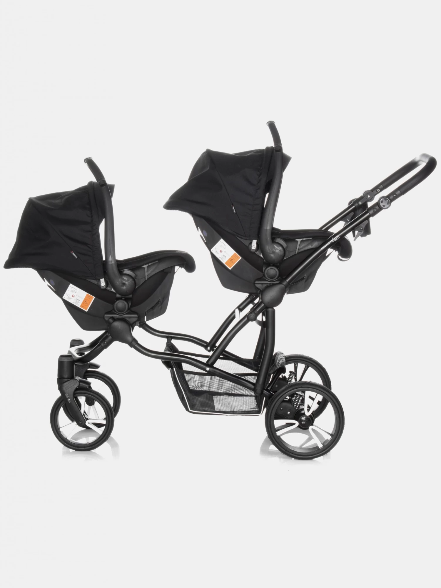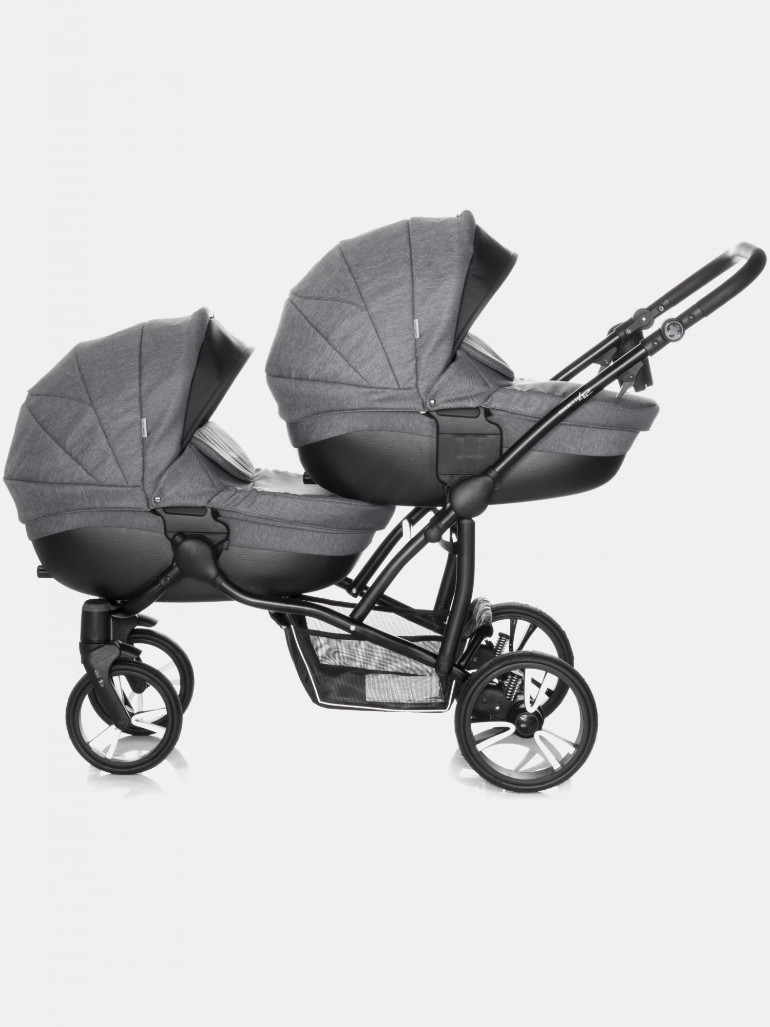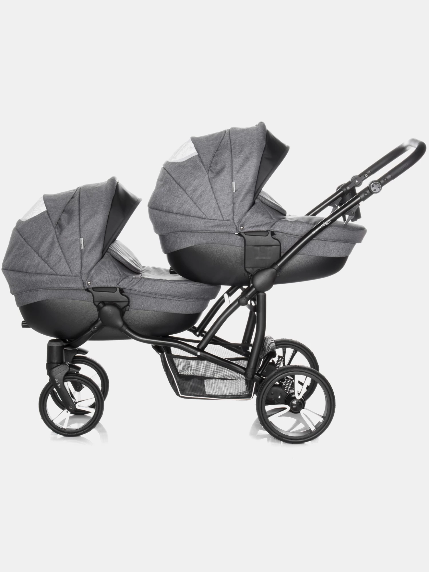 Bebetto 42 ist ein idealer Kinderwagen für Zwillinge, sowie für zwei Kinder im unterschiedlichen Alter, ein sogenannter Geschwisterwagen. Der Kinderwagen verfügt über zahlreiche Einstellungsvarianten, die für jede Situation und jeden Einsatz immer richtig angepasst werden können. Für Zwillinge wird Bebetto 42 mit zwei Babywannen empfohlen. Jede Babywanne verfügt über einen separaten Sonnenschutz, sowie ein verstellbares bzw. einstellbares Kopfteil, sodass auch hier die Einstellungsalternativen jedem Kind die richtige Liege- und Sitzposition gewähren. Mit einer Babywanne und dem Sportsitzaufsatz können Sie mühelos einen sehr schicken und funktionalen Geschwisterwagen zaubern. Dies wird immer dann nötig, wenn man zwei Kinder im unterschiedlichen Alter sicher und komfortabel transportieren möchte. Was den Kinderwagen auszeichnet, ist der leichte und stabile Aluminiumrahmen, sowie seine Abmessungen. Die Kinder sitzen in diesem Wagen nicht nebeneinander, sondern hintereinander, was gerade bei schmalen Türzargen von Vorteil ist. Zusammengeklappt passt er aufgrund seines Aufbaus in fast jeden Kofferraum. Erwähnenswert sind auch der große Einkaufskorb, die geräumige Wickeltasche, sowie andere Zusatzoptionen, die den Komfort erhöhen. Zu jedem Bebetto 42 gehören auch ein Moskito- und ein Regenschutz, die zusammengefaltet kaum Platz in Anspruch nehmen. Die Konstrukteure dieses Kinderwagens haben auch an den Fahrkomfort gedacht, egal ob Sie ihn mit der Babywanne oder dem Sportaufsatz nutzen. Die luftgefüllten Reifen und das SAS- bzw. DMS-System geben den Eltern eine komfortable Sicherheit beim Schieben dieses Kinderwagens. Die oben beschriebenen Funktionen machen den Kinderwagen zu einem echten Allrounder für jede Situation und Wetterlage. Egal was Sie suchen, der Bebetto 42 ist die richtige Entscheidung.