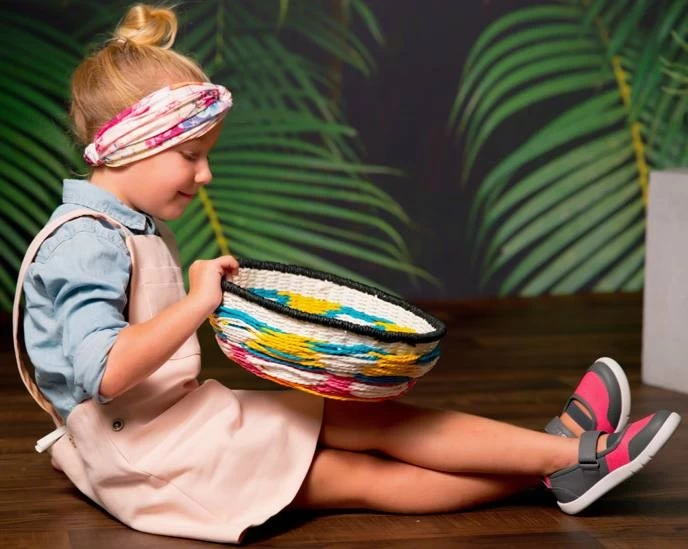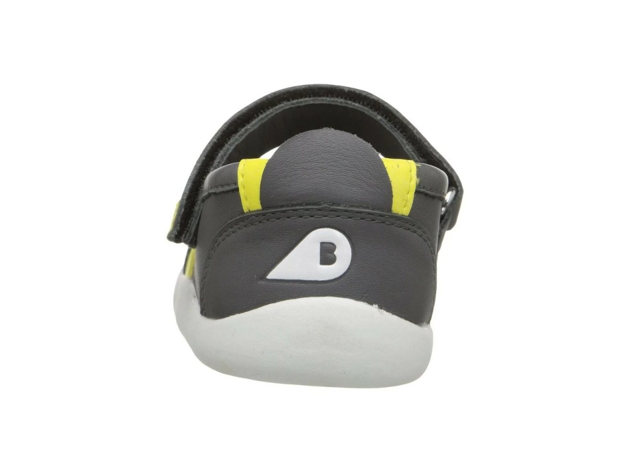 Ultra leichte BOBUX Mädchenschuhe im Mary Jane Style , das sommerliche Modell VITRA aus der neuen Bobux i-walk PLAY Kollektion ist dunkelgrau mit gelb und weisser Sohle . Die federleichten Barfußschuhe sind auch für den Waldkindergarten geeignet.