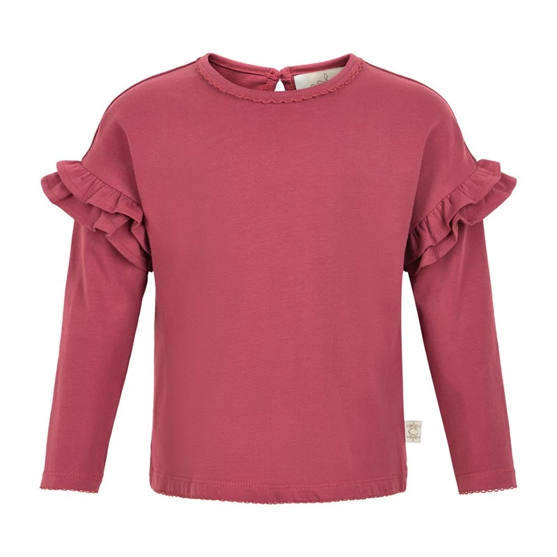 Das weiche Longsleeve Shirt sitzt sehr bequem. An den Raglanärmeln sind am Ansatz zwei kleine Rüschenvolants angenäht. Baumwolle ist hautsympathisch pflegeleicht. Der Elasthan-Anteil sorgt dafür, daß das Mädchenshirt auch nach vielen Wäschen seine Form behält. Die Kanten und der Rundhalsausschnit sind mit einen niedlichen Mäusezähnchenborte verziert. Paßt gut zu Jean , Röcken und besonders gut unter Trägerkleidchen.