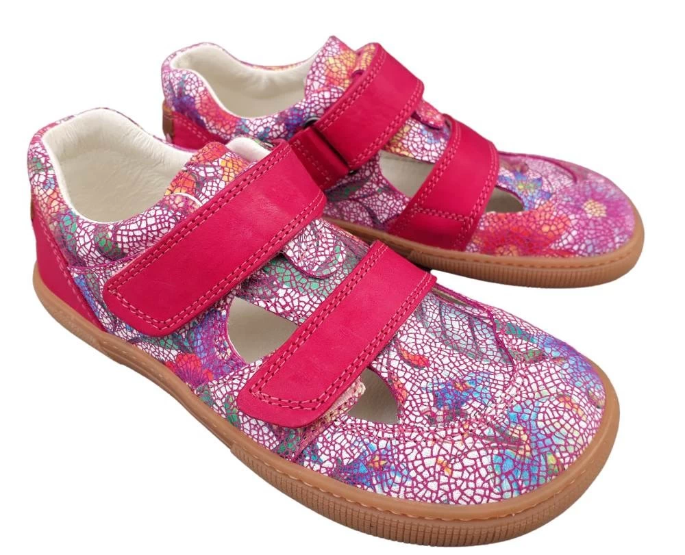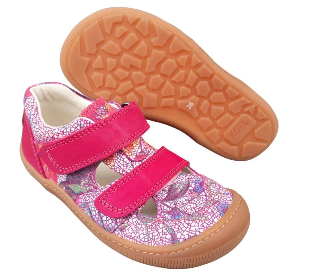 Extra weiche und flexible Koel Kinder Barfußsandalen in pink mit Blumenmuster. Die bequemen Kindersandalen werden aus weichem Bioleder hergestellt. Durch zwei verstellbare Klettriegel kann der Schuh individuell an den Fußrücken angepaßt werden. Die Minimalsohle ist extra weich und flexibel. Das sorgt für ein großartiges Laufgefühl und Bewegungsfreiheit für den Fuß. Die bequem geschnittene Paßform bietet den Zehen viel Platz zum Abrollen.