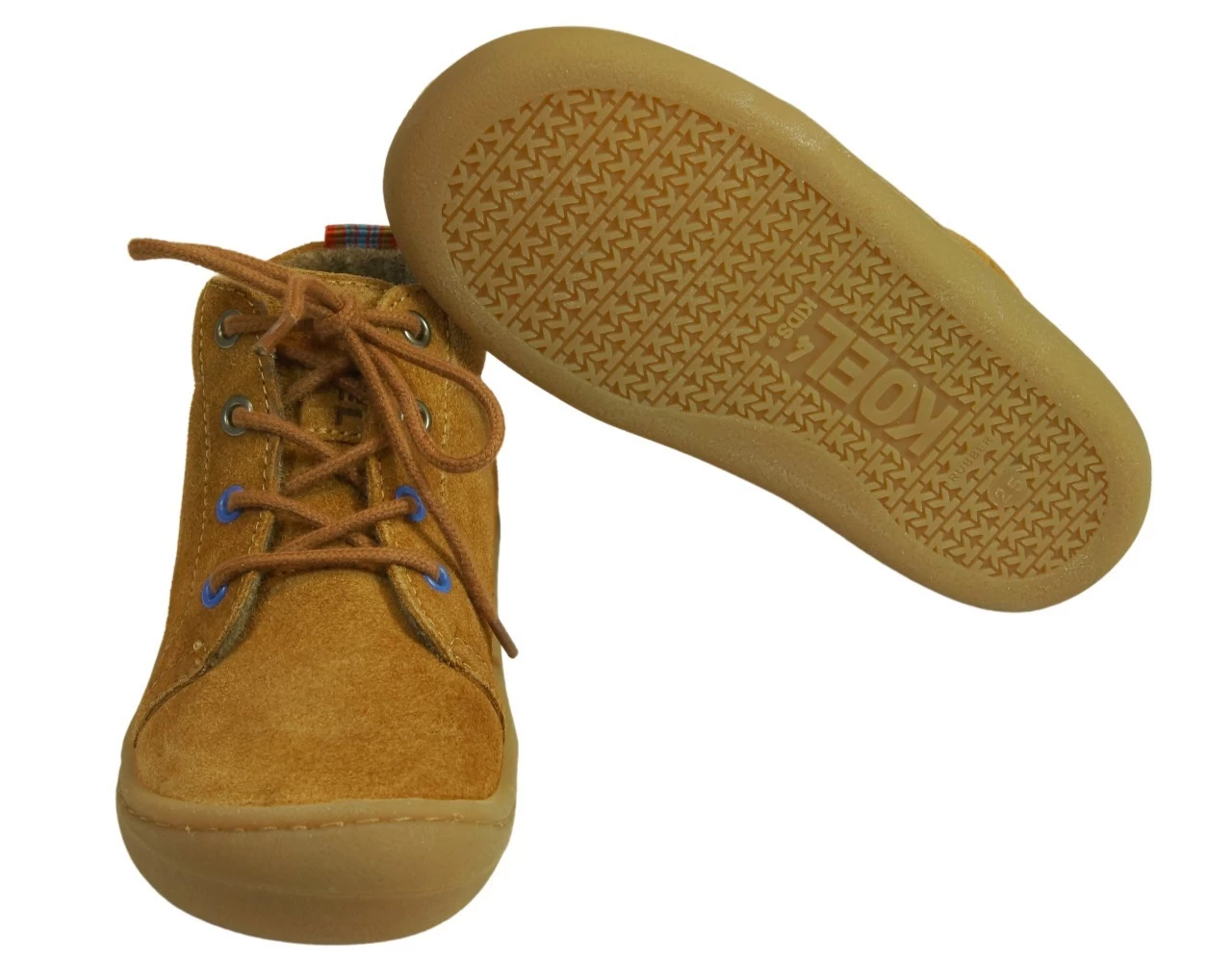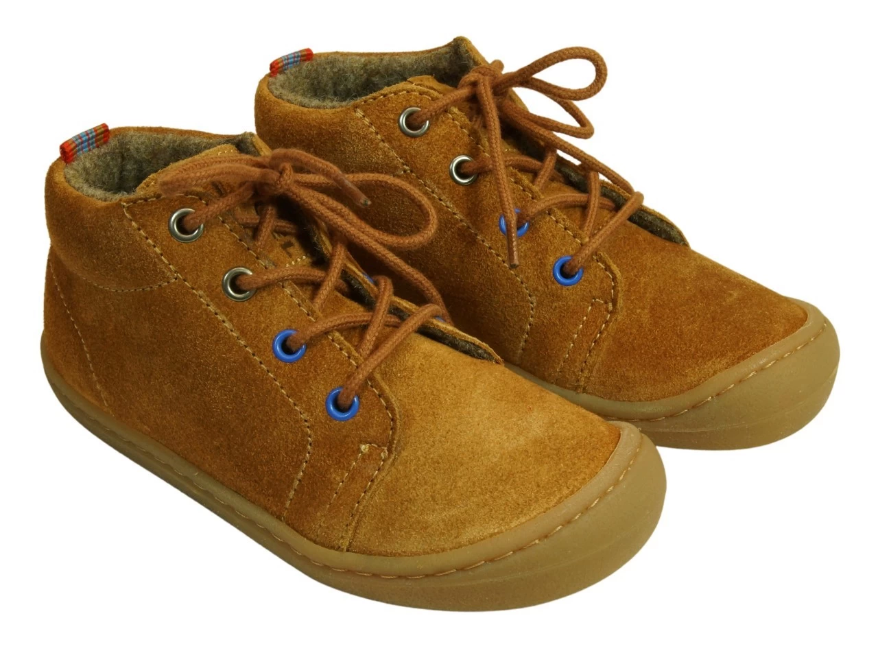 Extra weiche und flexible KOEL Schnürer in camel. Der schöne zimtbraune Farbton paßt für Mädchen und Jungen gleichermaßen. Die bequemen knöchelhohen Kinder-Schnürschuhe werden aus weichem Bio-Velourleder hergestellt. Das kuschelweiche Futter aus Wollfleece sorgt für warme Füße. Durch die Schnürsenkel kann der bequeme Kinderschuh perfekt an den Fuß angepasst werden. Die Minimalsohle ist extra weich und flexibel. Das sorgt für ein großartiges Laufgefühl und Bewegungsfreiheit für den Fuß. Die bequem geschnittene Paßform bietet den Zehen viel Platz zum Abrollen.