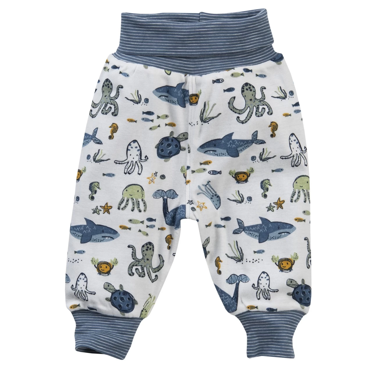 2 Designs, da Modell zum Wenden: eine Seite detailverliebter All-over-Print „Unterwasserwelt“ auf weißem Grundstoff, andere Seite blau-weiß geringelt. Breiter, dehnbarer Umschlagbund und Bündchen sorgen für den perfekten Sitz und viel Bewegungsfreiheit. Bündchen am Fuß verhindern hochrutschen. Baumwolle aus kontrolliert biologischem Anbau | „organic“ gem. GOTS | zertifiziert durch Ecocert Greenlife, Liz. Nr. 151811